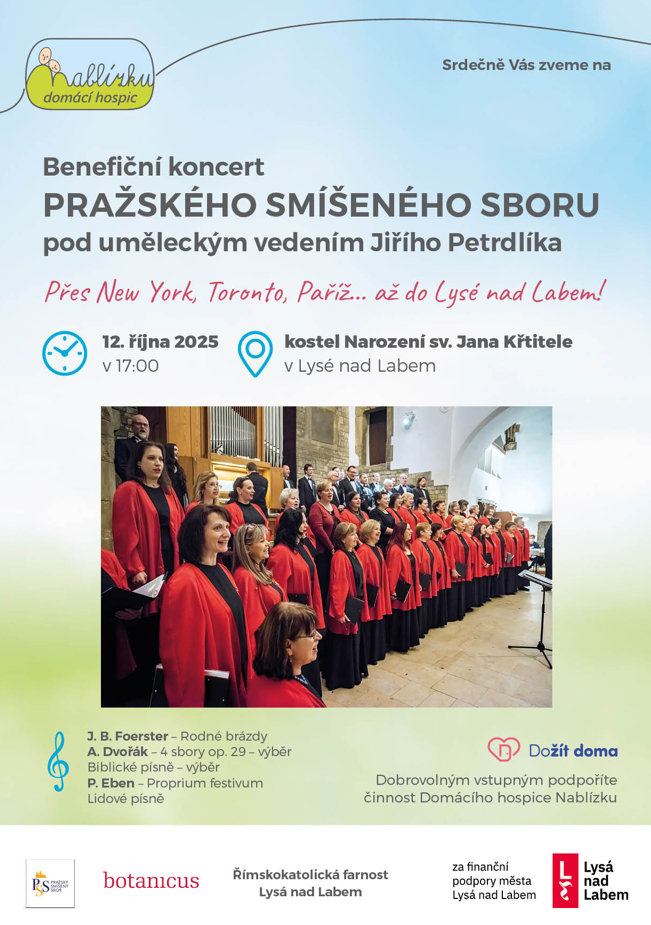 Zveme vás na benefiční koncert Pražského smíšeného sboru, který proběhne v rámci celorepublikové kampaně Dožít doma. Tento renomovaný soubor pod uměleckým vedením pana Jiřího Petrdlíka vystupoval v mnohých světových metropolích a nyní zazní hudba českých skladatelů v Lysé nad Labem.