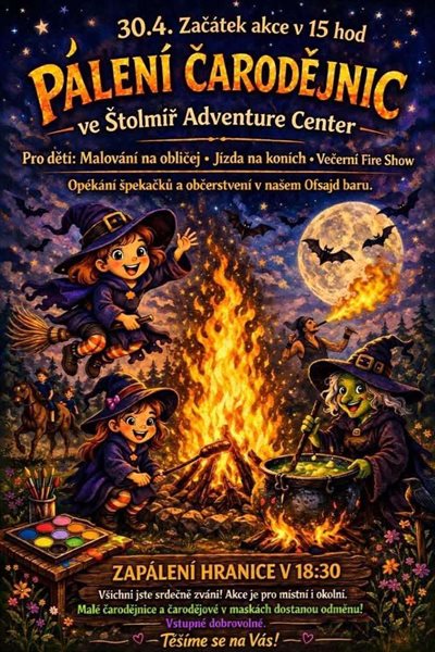 Konají se tu hned čtyři pálení čarodějnic. Navštivte třeba Štolmíř Adventure Center, ve kterém bude připraveno i malování na obličej a jízdy na koních nebo liblické hřiště. Další pozvánka vede na tenis, netradiční večer můžete strávit také v Kino Kavárně, kde bude probíhat nejen hraní deskových her.