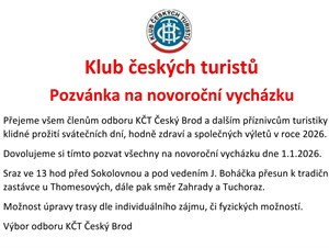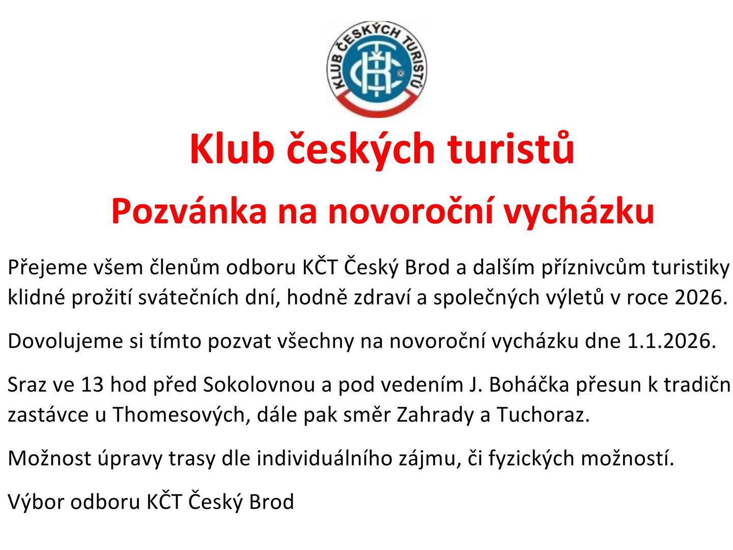 KČT: Novoroční vycházka čtvrtek 01. ledna 2026 Místo konání: Český Brod Čas: od 13:00 Pořadatel: Klub českých turistů Štítky: turistika Popis akce Zpět
