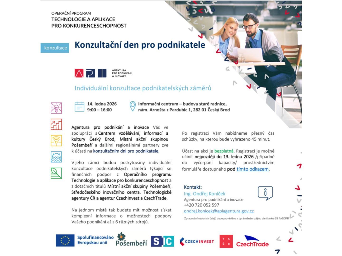 Konzultace budou poskytovat zástupci Agentury pro podnikání a inovace, MAS Pošembeří, agentur CzechInvest a CzechTrade, Středočeského inovačního centra a Technologické agentury ČR.