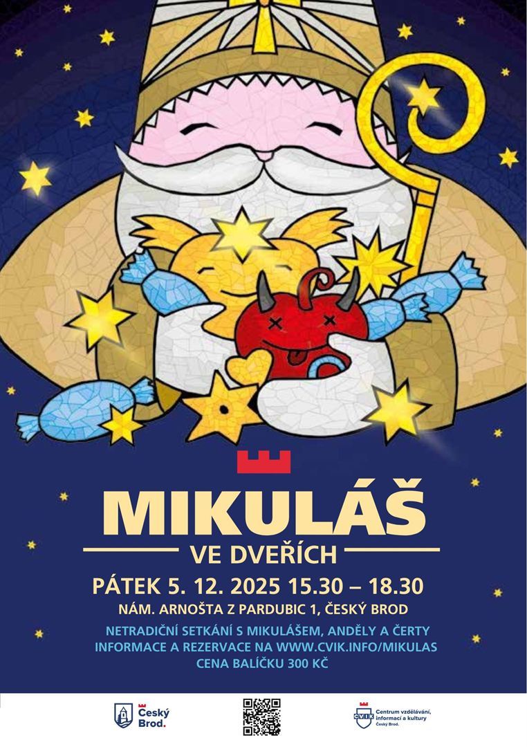 Mikuláš ve dveřích je tradiční českobrodská akce s hezkou atmosférou. Mikuláš, anděl a čert předají vašemu dítěti balíček dobrot a promluví s ním o pochvalách a hříších.