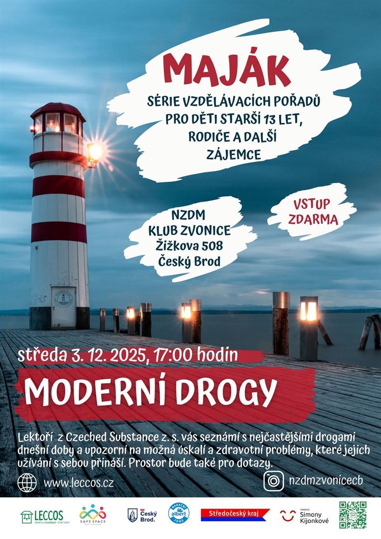 NZDM Klub Zvonice zve všechny děti starší 13 let, rodiče i další zájemce na další setkání ze série vzdělávacích pořadů MAJÁK, tentokrát na velmi aktuální téma Moderní drogy.