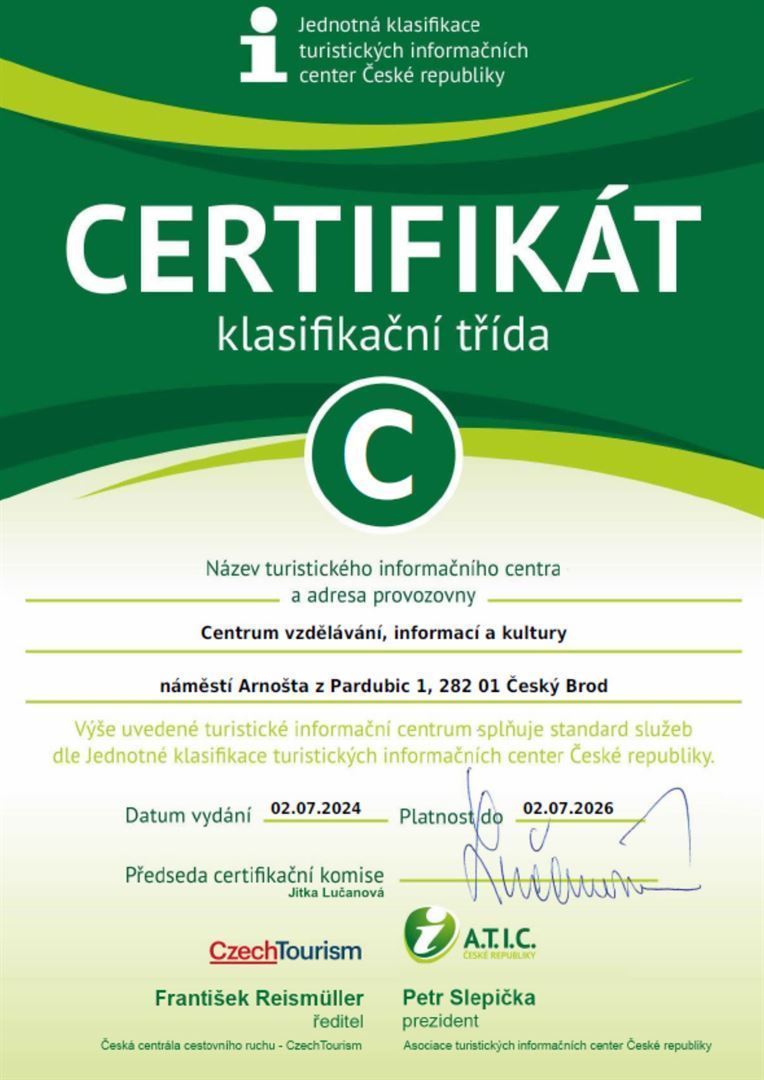 Jsme členem Asociace turistických informačních center (ATIC) a v rámci jednotné klasifikace držitelem certifikátu v kategorii C. Mezi naše hlavní činnosti patří propagace města Český Brod a jeho místních organizací, poskytování informací turistům i obyvatelům města a jeho spádového regionu. Dále se podílíme na zajišťování kulturních akcí a dalších službách s tím spojených.