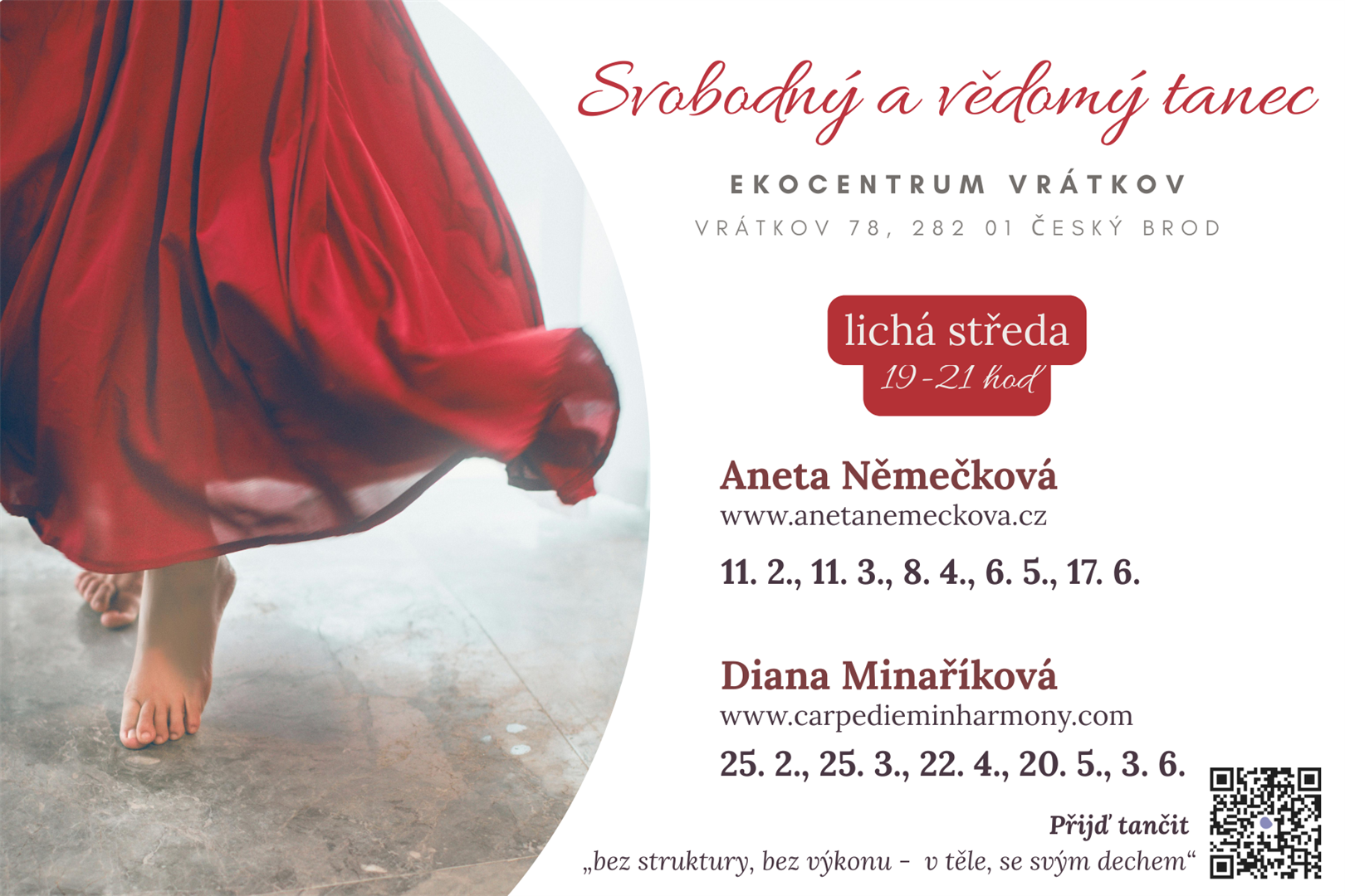 a radostí z pohybu. Tanec nám dává odvahu být sami sebou – bez masek, bez hodnocení, v plné přítomnosti. Přijďte se rozhýbat, nadechnout a dopřát si čas jen pro sebe.