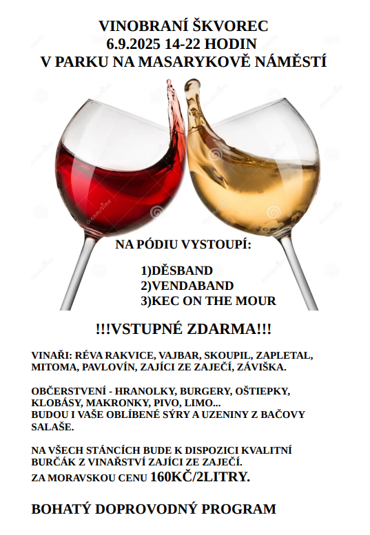 Zveme vás na historicky první škvorecké vinobraní. Představí se zde vinaři z celé republiky. Vystoupí mimo jiné místní kapely Děsband a Kec on the Mour. Ochutnat můžete regionální pochoutky a nebude chybět BURČÁK za moravskou cenu!