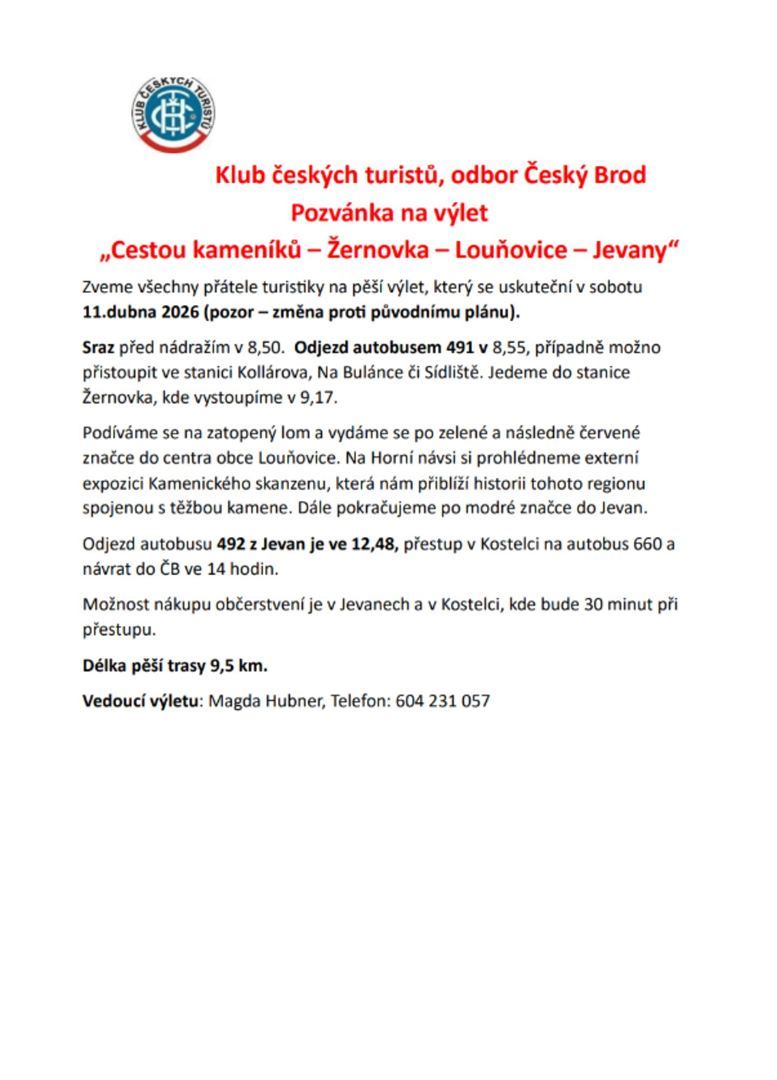 Výlet KČT: Cestou kameníků Žernovka – Louňovice – Jevany