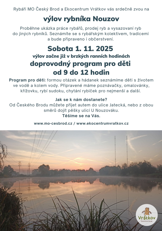 Srdečně vás zveme na hlavní výlov rybníka Nouzov, v Českém Brodě, za Jateckou ulicí.